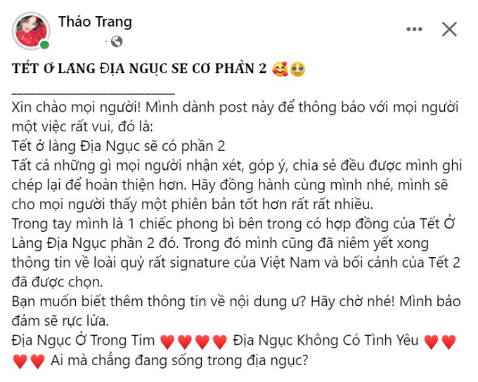 Tiếp nối thành công của Tết ở làng Địa Ngục, nhà văn Thảo Trang vừa đăng tải bài viết trên trang cá nhân, xác nhận sẽ có phần 2. Nội dung của câu chuyện sẽ kể về loài quỷ đặc trưng của Việt Nam. Cụ thể, tác giả chia sẻ: “Xin chào mọi người! Mình dành post này để thông báo với mọi người một việc rất vui, đó là: Tết ở làng Địa Ngục sẽ có phần 2. Tất cả những gì mọi người nhận xét, góp ý, chia sẻ đều được mình ghi chép lại để hoàn thiện hơn. Hãy đồng hành cùng mình nhé, mình sẽ cho mọi người thấy một phiên bản tốt hơn rất rất nhiều. Trong tay mình là 1 chiếc phong bì bên trong có hợp đồng của Tết ở làng Địa Ngục phần 2 đó. Trong đó mình cũng đã niêm yết xong thông tin về loài quỷ rất signature của Việt Nam và bối cảnh của Tết 2 đã được chọn”.