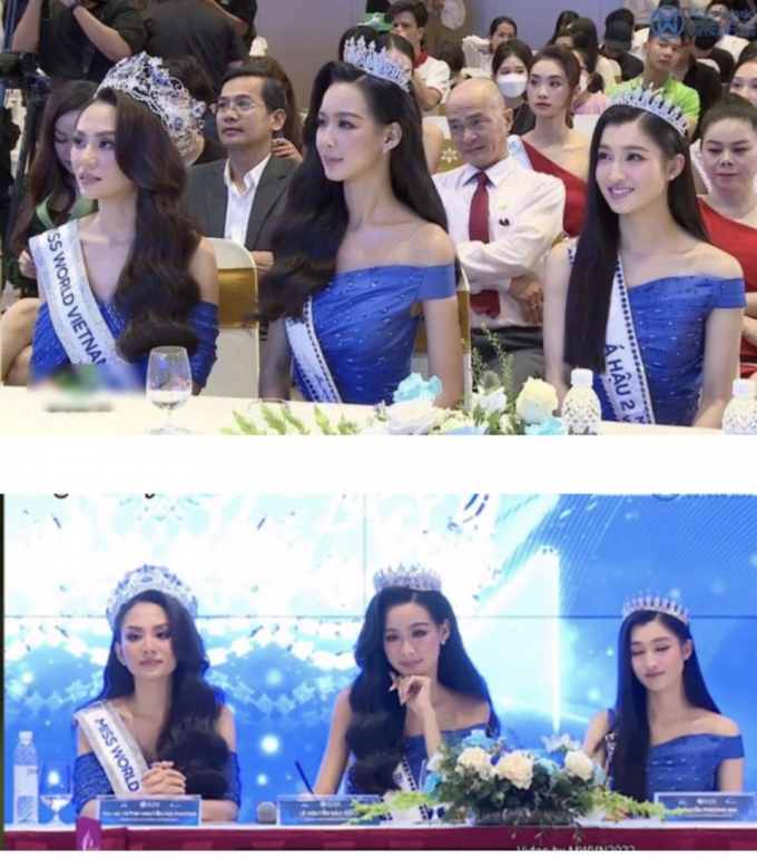 Gần đây, trong một sự kiện gặp gỡ nhà tài trợ, top 3 Miss World Vietnam 2022 tiếp tục khiến netizen tranh cãi "nảy lửa" vì vị trí đứng của Mai Phương và Bảo Ngọc. Theo đó, thông qua đoạn clip và 1 số hình ảnh trên mạng xã hội, 3 nàng hậu cùng diện những thiết kế màu xanh nhạt, xuất hiện đầy rạng rỡ với nhan sắc xinh đẹp.