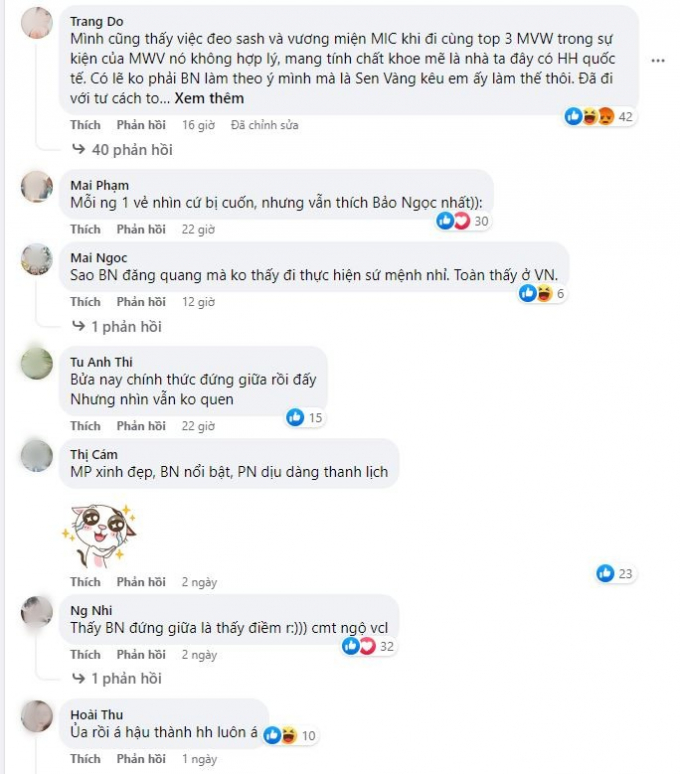 Bên cạnh những fans bất bình thì cũng không ít người lại cho rằng việc Bảo Ngọc đăng quang Miss Intercontinental - Hoa hậu Liên lục địa 2022 mang đẳng cấp quốc tế, lớn hơn danh hiệu Miss World Vietnam 2022 của Mai Phương, nên việc Bảo Ngọc đứng trung tâm là điều có thể hiểu được.