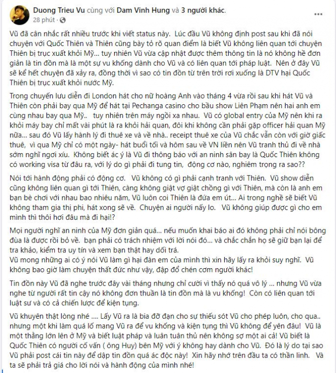 Trên facebook cá nhân, Dương Triệu Vũ đã có bài chia sẻ khá dài nói về việc bản thân liên quan đến câu chuyện ca sĩ Quốc Thiên bị trục xuất khỏi Mỹ. Theo bài chia sẻ, tin đồn diễn ra cách đây vài tháng nhưng ở thời điểm đó Dương Triệu Vũ chỉ cảm thấy buồn cười vì nó quá vô lý nên đã bỏ qua.