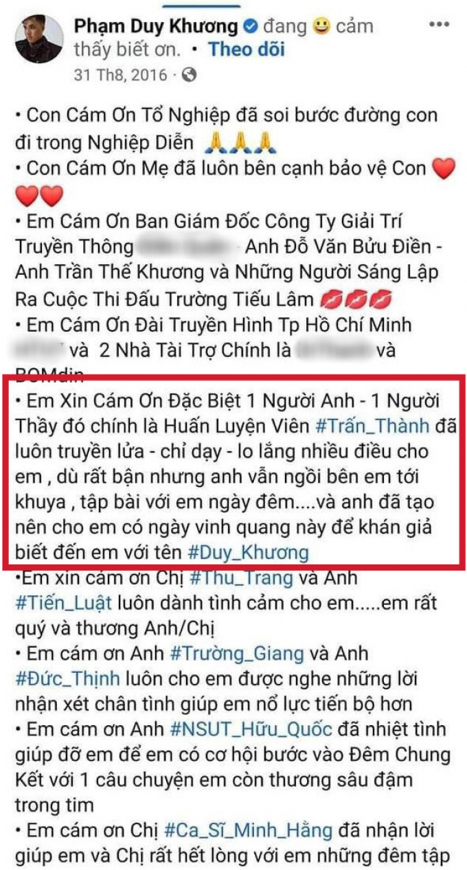 "Em xin cảm ơn đặc biệt 1 người anh - 1 người thầy đó chính là huấn luyện viên Trấn Thành đã luôn truyền lửa, chỉ dạy, lo lắng nhiều điều cho em, dù rất bận nhưng anh vẫn ngồi bên em tới khuya, tập bài với em ngày đêm. Và anh đã tạo nên cho em có ngày vinh quang này để khán giả biết đến em với tên Duy Khương". - Duy Khương từng viết.
