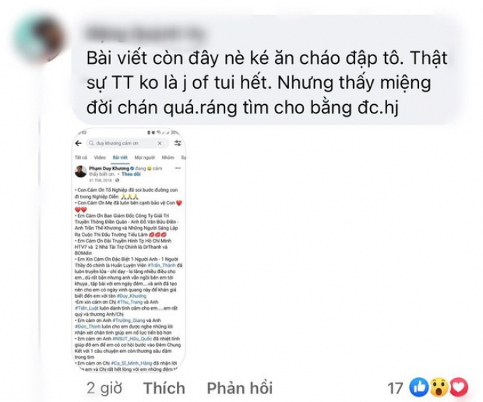 Một netizen để lại bình luận cho rằng Duy Khương đã nói sai sự thật và "ăn cháo đá bát". Thậm chí, tài khoản mạng xã hội này còn đăng tải bài viết cách đây 7 năm của Duy Khương từng gọi nam MC Trấn Thành là người anh - người thầy.