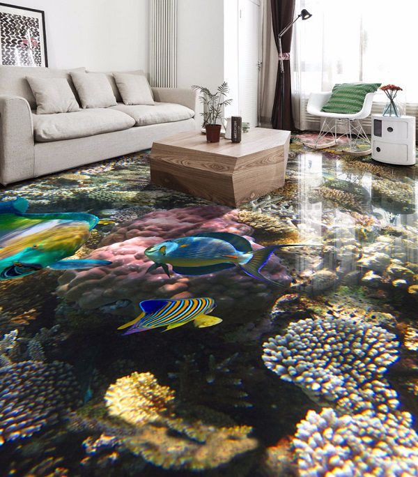 Gạch ốp lát nền 3D được in hình giống như tranh 3D với những họa tiết sống động, chân thật như hoa lá, cây cỏ, động vật, đại dương...