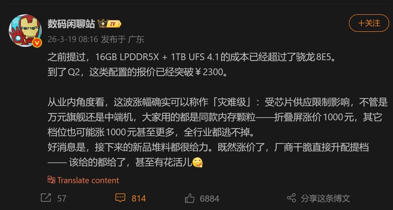 Digital Chat Station nhận định, sự tăng giá này xuất phát từ tình trạng khan hiếm nguồn cung chip, khiến cả các mẫu smartphone cao cấp trên 10.000 tệ (~38 triệu đồng) lẫn thiết bị tầm trung đều phải sử dụng cùng loại bộ nhớ. Nếu các mẫu màn hình gập tăng giá thêm 1.000 tệ (~3,8 triệu đồng), các phân khúc khác cũng có thể tăng tương ứng hoặc thậm chí cao hơn, tác động đến toàn bộ ngành di động.
