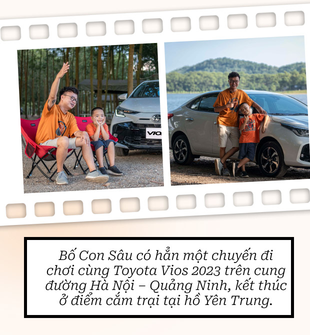 Để tìm được mẫu xe phù hợp, anh Lê Xuân Đức đã tham khảo từ online, tới đi thử xe của bạn bè, thử xe ở một số đại lý ô tô. Riêng đối với Toyota Vios 1.5G-CVT phiên bản 2023, anh đã có hẳn một chuyến đi chơi cùng cậu con trai Sâu của mình trên cung đường Hà Nội – Quảng Ninh để cắm trại tại hồ Yên Trung.