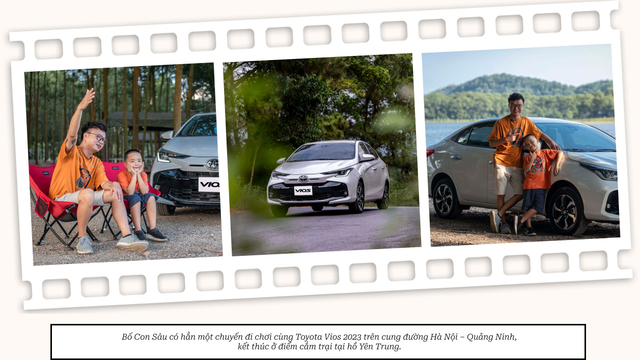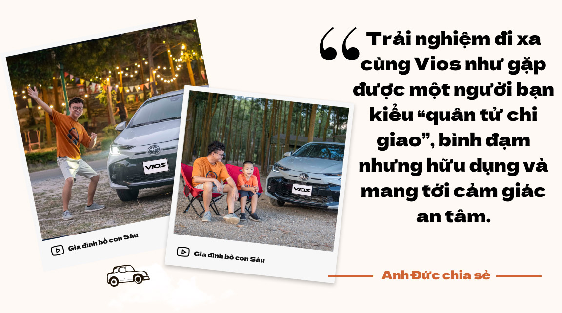 Trên hành trình Hà Nội – Uông Bí – Hà Nội dài gần 300km, anh Lê Xuân Đức và bé Sâu đã có những trải nghiệm thú vị khi cùng nhau tận hưởng không gian thoáng đãng của hồ Yên Trung, khám phá thiên nhiên của vùng đất Uông Bí và đặc biệt là hiểu thêm và có nhiều thiện cảm hơn với chiếc Toyota Vios 1.5G-CVT. Anh phát hiện, trải nghiệm đi xa cùng Vios như gặp được một người bạn kiểu "quân tử chi giao đạm như thủy". Vios 2023 phù hợp với mọi tiêu chí lựa chọn xe của anh: bền bỉ, tiết kiệm, trang bị phù hợp và đủ dùng, có thể đồng hành bình đạm nhưng dài lâu.