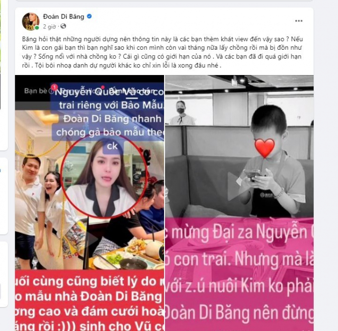 "Băng hỏi thật những người dựng nên thông tin này là các bạn thèm khát view đến vậy sao? Nếu Kim là con gái bạn thì bạn nghĩ sao khi con mình còn vài tháng nữa lấy chồng rồi mà bị đồn như vậy? Sống nổi với nhà chồng không? Cái gì cũng có giới hạn của nó. Và các bạn đã đi quá giới hạn rồi tội bôi nhọ danh dự người khác không chỉ xin lỗi là xong đâu nhé", Đoàn Di Băng bộc bạch trên trang cá nhân.