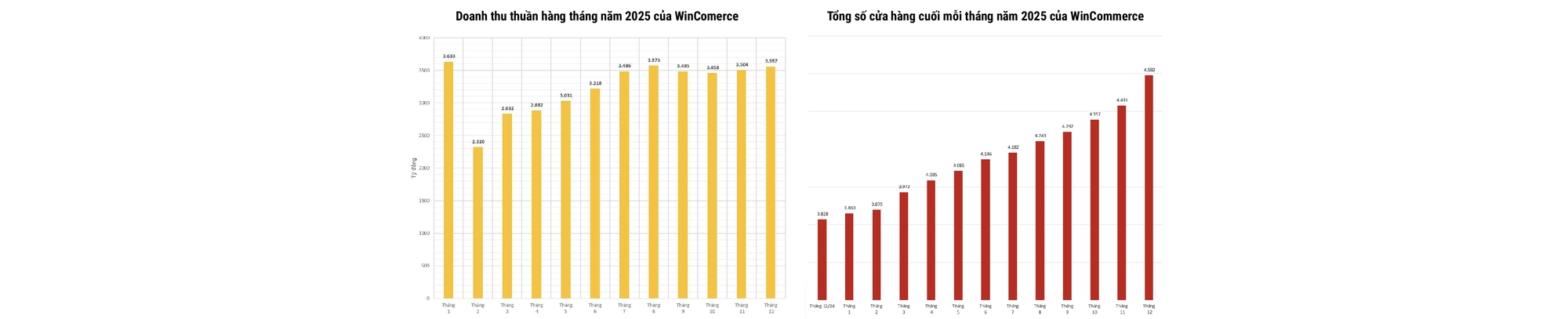 Tháng 12/2025, doanh thu đạt 3.557 tỷ đồng, tăng 19,0%. Tăng trưởng trên từng cửa hàng (LFL) đạt 8,6%. Đặc biệt, WinCommerce đã mở mới 161 cửa hàng chỉ trong 31 ngày của tháng 12 – con số kỷ lục chưa từng có kể từ năm 2019 và nâng số lượng cửa hàng trên toàn quốc lên con số 4.592.