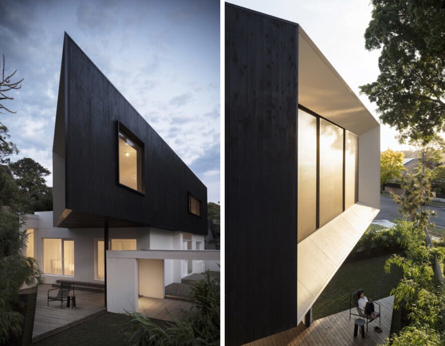 Điểm nổi bật của công trình chính là phần cơi nới thêm ở phía trên. Khác với toàn bộ khối nhà tầng trệt, phần cơi nới thêm được bao bọc trong một lớp gỗ màu đen tuyền, đua ra tạo thành mái che cho khoảng sân hiên bên dưới.