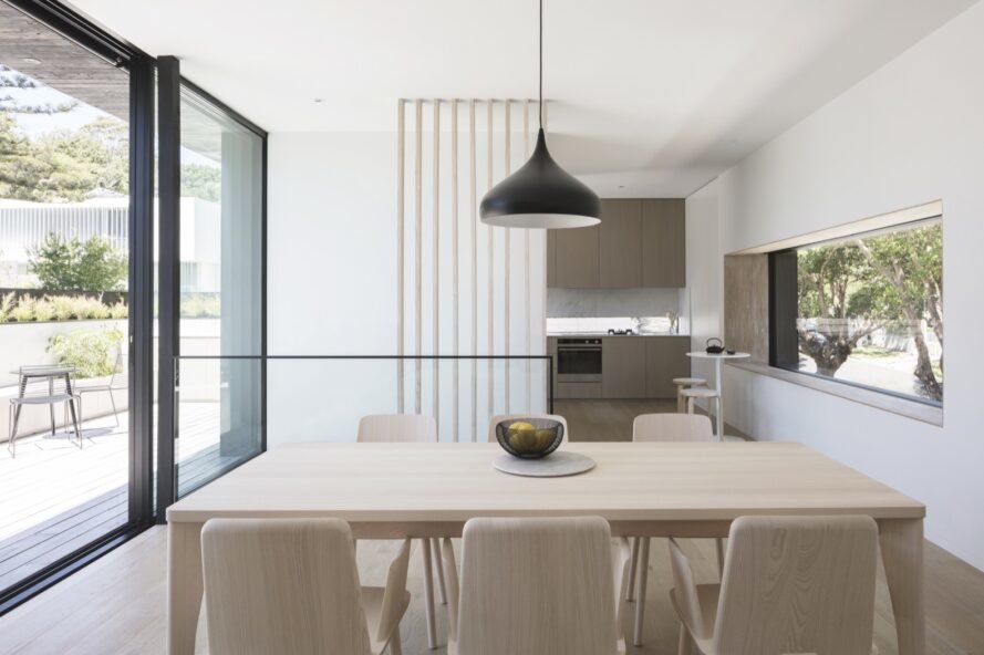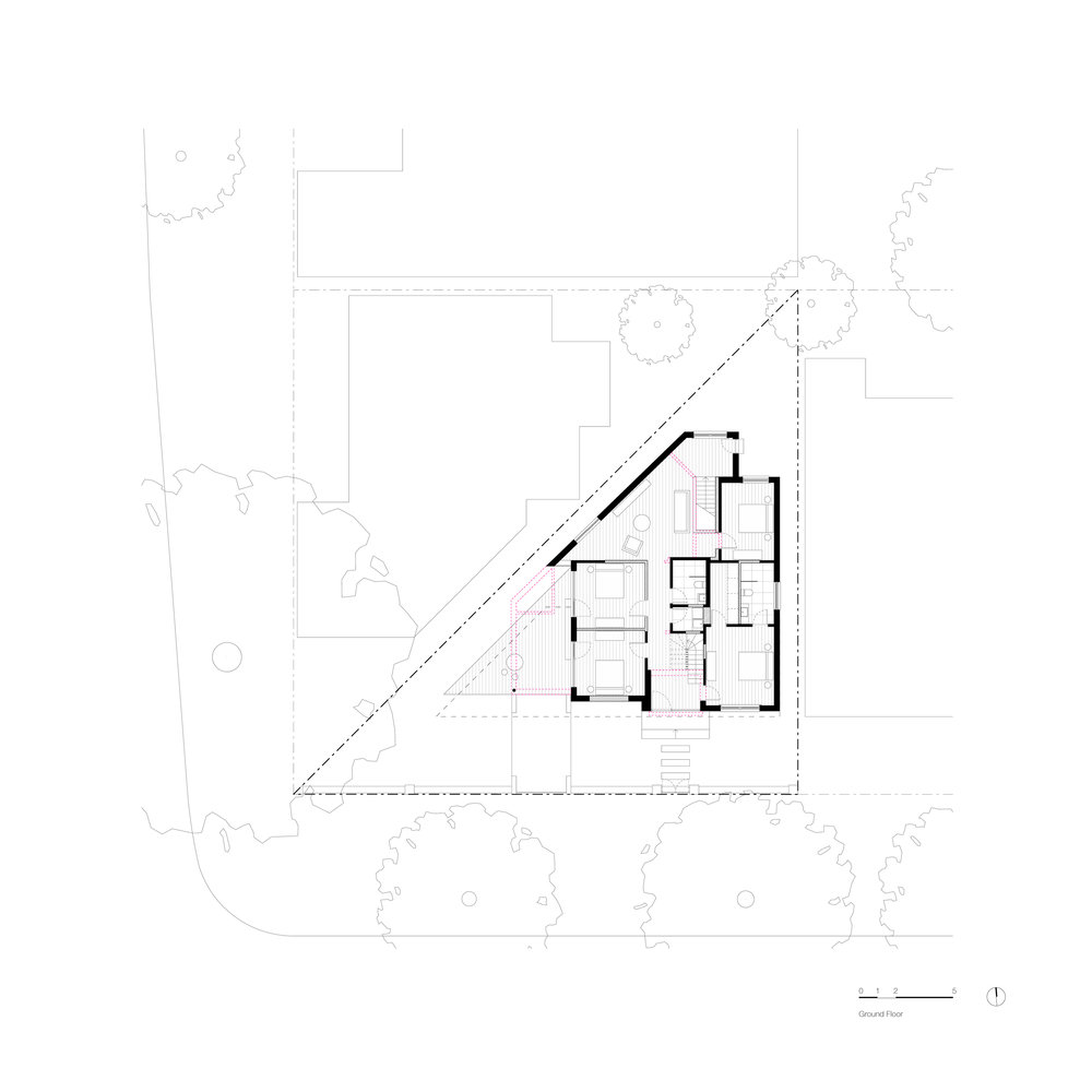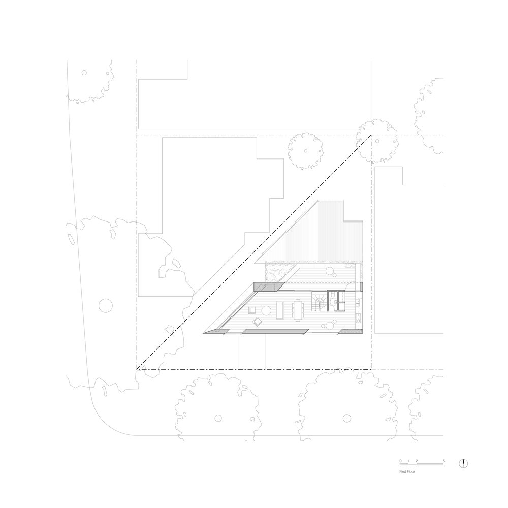 Đáp trả lại hình dạng dị thường của mảnh đất, những đường xiên chéo hiện diện ở khắp nơi trong ngôi nhà, từ cửa sổ cho đến khu vực thư giãn ngoài trời.