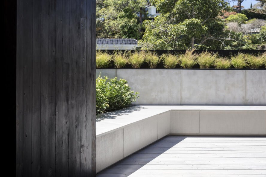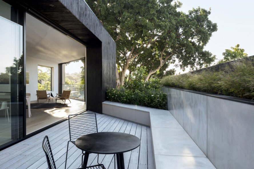 Nhằm tăng cường sự riêng tư, khối nhà mới được bao bọc một phần bằng các tấm kim loại đột lỗ. Tấm chắn này cũng có tác dụng bảo vệ ngôi nhà khỏi cái nắng mặt trời gay gắt trong khi vẫn cho phép ánh sáng tự nhiên đi vào bên trong.