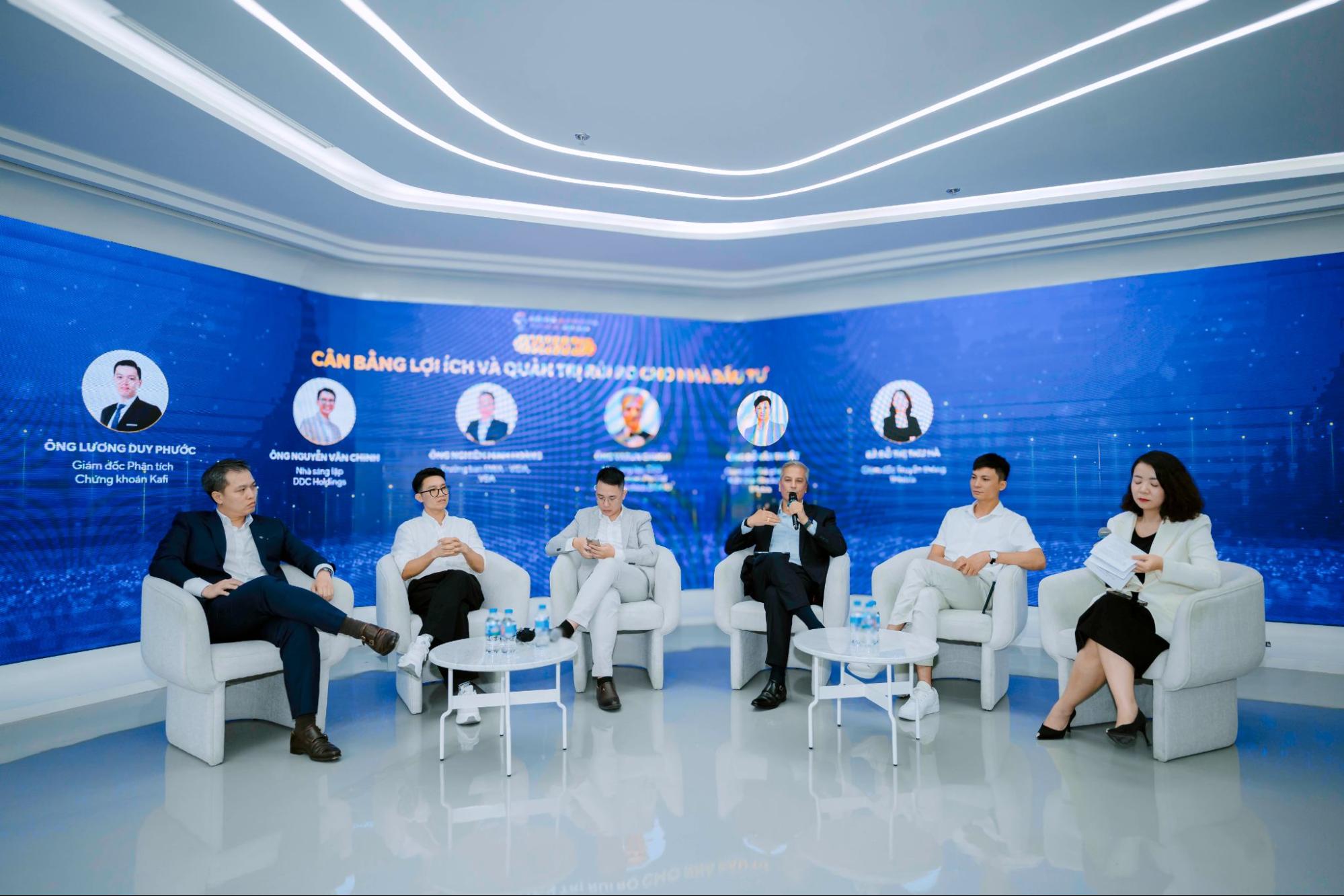 (Từ trái qua phải) Ông Lương Duy Phước, ông Nguyễn Văn Chinh, ông Nghiêm Minh Hoàng, ông Varun Chugn, TS. Đỗ Văn Thuật và bà Đỗ Thị Thu Hà cùng thảo luận về bài toán cân bằng lợi ích và quản trị rủi ro cho nhà đầu tư.