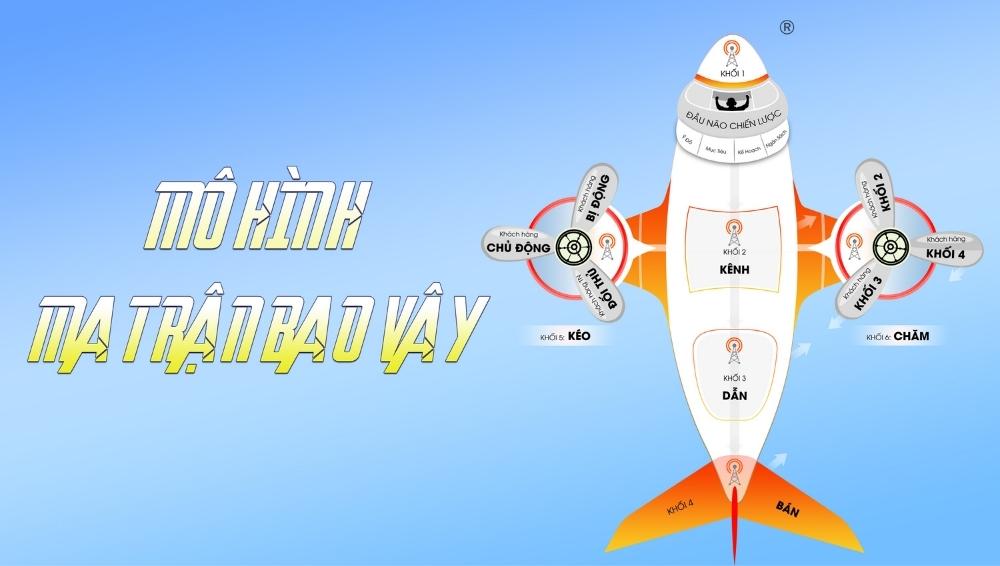 Lấy cảm hứng từ hình tượng máy bay, Ma Trận Bao Vây chia hoạt động marketing thành 6 khối chức năng. Mỗi khối có nhiệm vụ rõ ràng, sắp xếp theo trình tự logic: