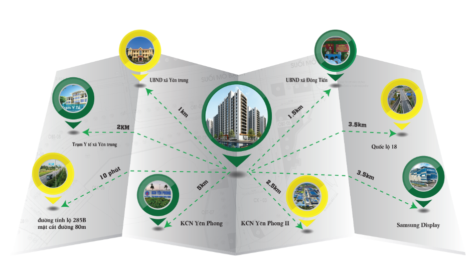 Dự án GandHome Yên Phong nhờ nằm ở trung tâm nên thuận tiện di chuyển đến các địa điểm sau: Cách UBND xã Yên Trung 1 km, UBND xã Đông Tiến 1,5 km, trạm y tế Yên Trung 2 km, Kcn Yên Phong II 2,5 km, thị trấn Chờ 3,5 km, Samsung Display 3,5km, Quốc lộ 18 3,5 km, khu công nghiệp Yên Phong I 5 km.