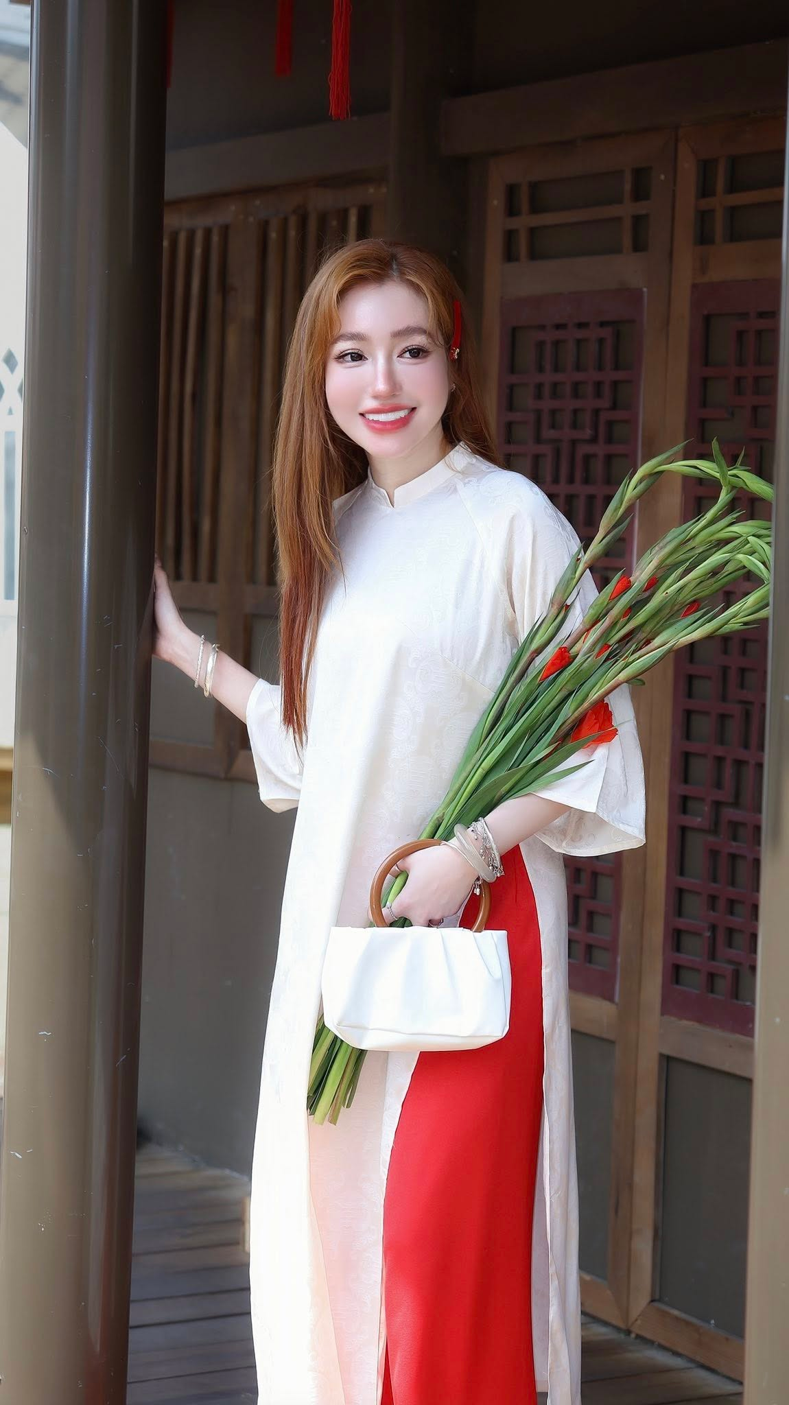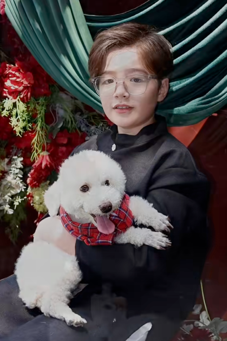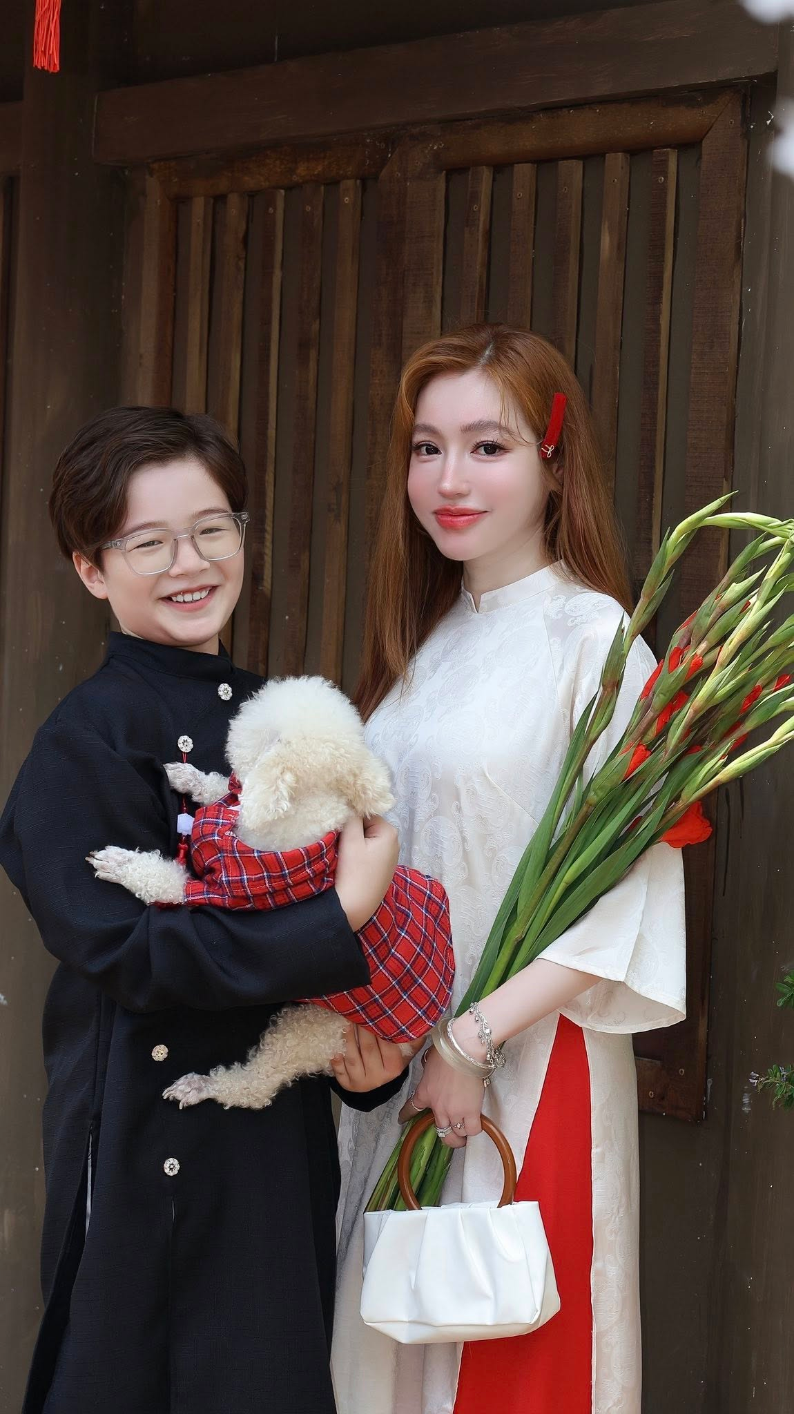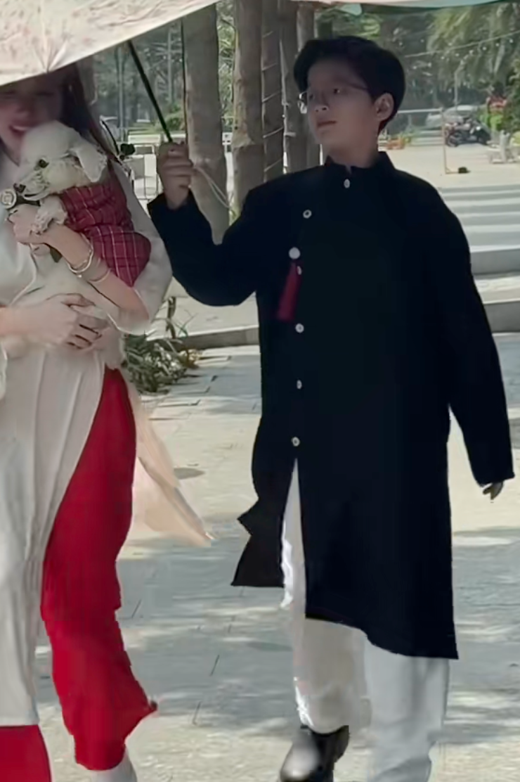 Mới ngày nào, Alfie còn là cậu bé xíu xiu, thường xuyên xuất hiện trong những bộ ảnh với đôi má phúng phính và ánh mắt tròn xoe, được mẹ bế ẵm đi khắp các sự kiện. Vậy mà giờ đây, ở tuổi lên 8, Alfie đã khiến nhiều người ngỡ ngàng bởi sự lớn phổng phao, cao gần bằng mẹ. Diện bộ áo dài truyền thống với phong thái đĩnh đạc, cậu bé toát lên vẻ điển trai, lãng tử như một "soái ca nhí" thực thụ.