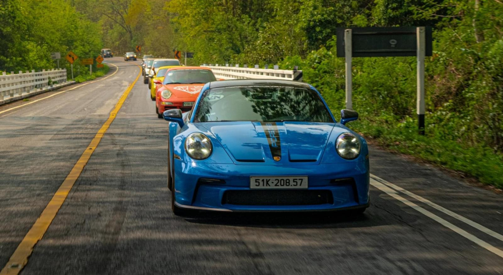 Trong chuyến đi này, đoàn xe Porsche chỉ có 3 mẫu xe thể thao 2 cửa là 718 Cayman, 911 đời 997 và cuối cùng là 911 GT3 thế hệ 992, bản mới nhất, được mệnh danh xe đua đường phố do ông Nguyễn Quốc Cường hay còn gọi Cường "Đô-la" cầm lái.