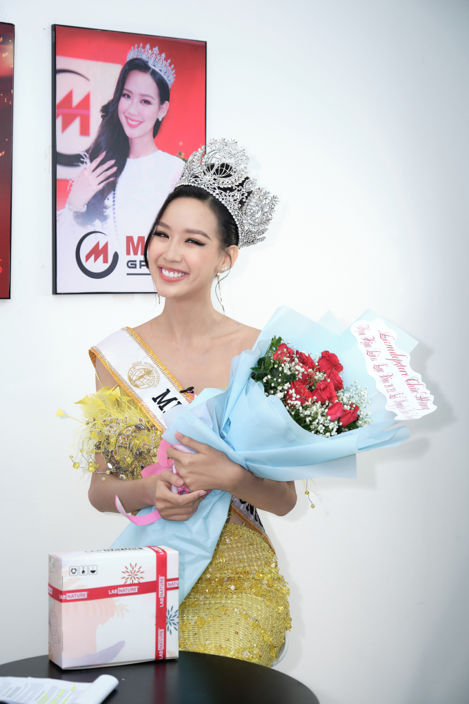 Xuất hiện tại buổi giao lưu trực tuyến, "nàng hậu khủng long" xinh đẹp rạng ngời trong chiếc đầm vàng hở vai. Dù bận lịch trình dày đặc sau đăng quang, Bảo Ngọc vẫn giữ được thần sắc tươi tắn và năng lượng.