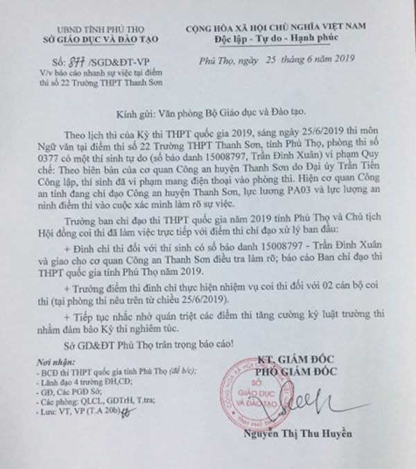 Căn cứ tính chất, mức độ của nội dung vụ việc, Công an tỉnh Phú Thọ đã tham mưu cho Ban Chỉ đạo thi THPT Quốc gia tỉnh Phú Thọ đình chỉ thi đối với thí sinh Trần Đình Xuân và 2 giám thị coi thi là Phí Thị Mai Linh, giáo viên Trường THPT Minh Hò (huyện Yên Lập, Phú Thọ) và Nguyễn Văn Huyên, giảng viên Học viện Ngoại giao.