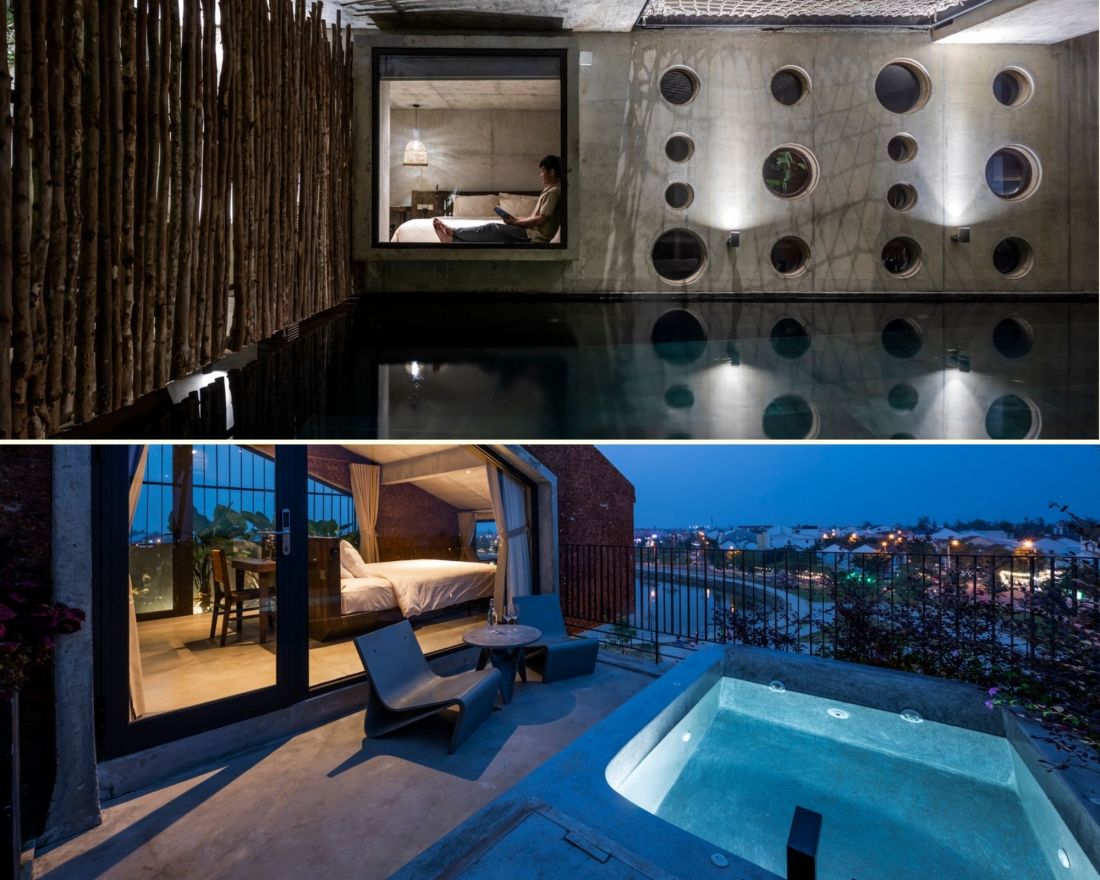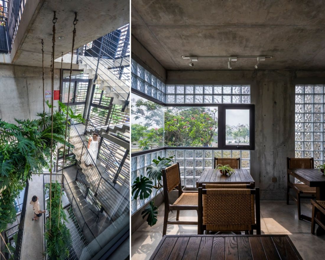 Các chi tiết nội thất nhỏ từ chốt cửa gỗ, bàn làm việc bằng gỗ, đến hàng rào và cổng gỗ đều gợi lên nét di sản văn hóa của Hội An. Các khối nhà được thiết kế theo hình lego xếp chồng lên nhau với điểm nhấn là những mảng bê tông.