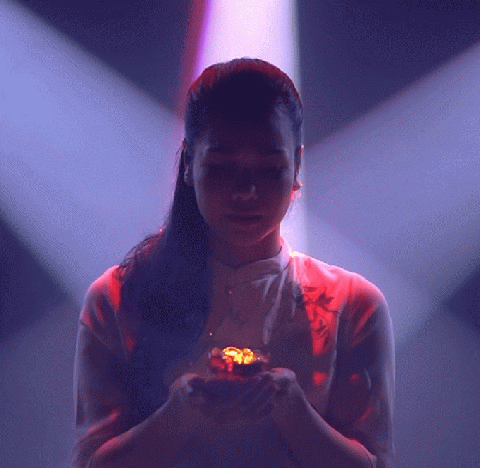 Hình ảnh nữ ca sĩ mặc áo dài tay chắp đèn khiến khán giả xót xa cho câu chuyện không nên xảy ra với cô bé Vân An