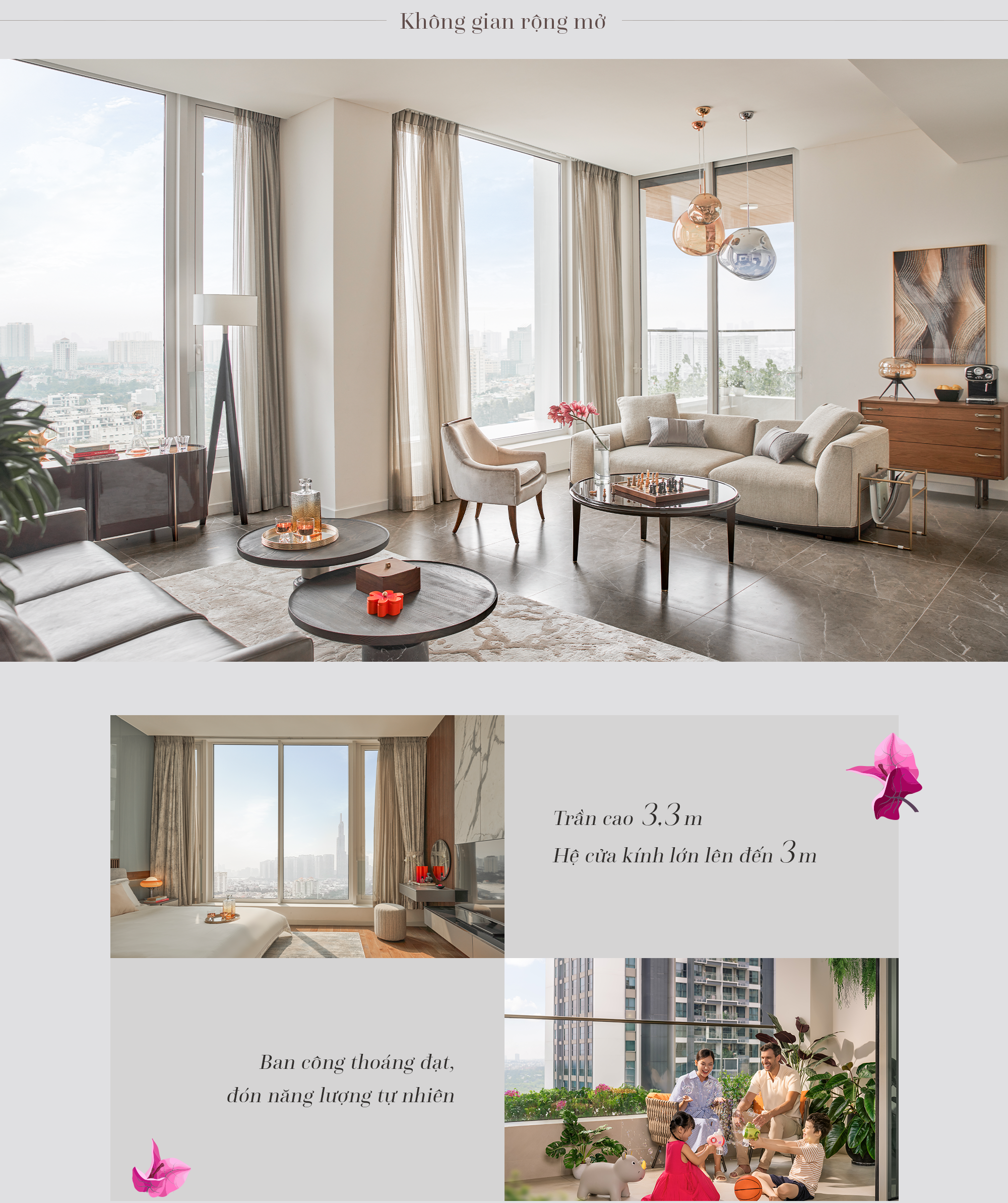 Căn hộ được mở rộng theo chiều cao với trần 3,3m, kết hợp hệ cửa kính lớn và ban công thoáng đạt, cho phép ánh sáng và luồng khí tự nhiên lan tỏa sâu vào bên trong. Mỗi yếu tố không được thêm vào để tạo ấn tượng, mà để phục vụ một trạng thái sống cân bằng, nơi công năng, thẩm mỹ và cảm nhận cùng hiện diện một cách hài hòa.