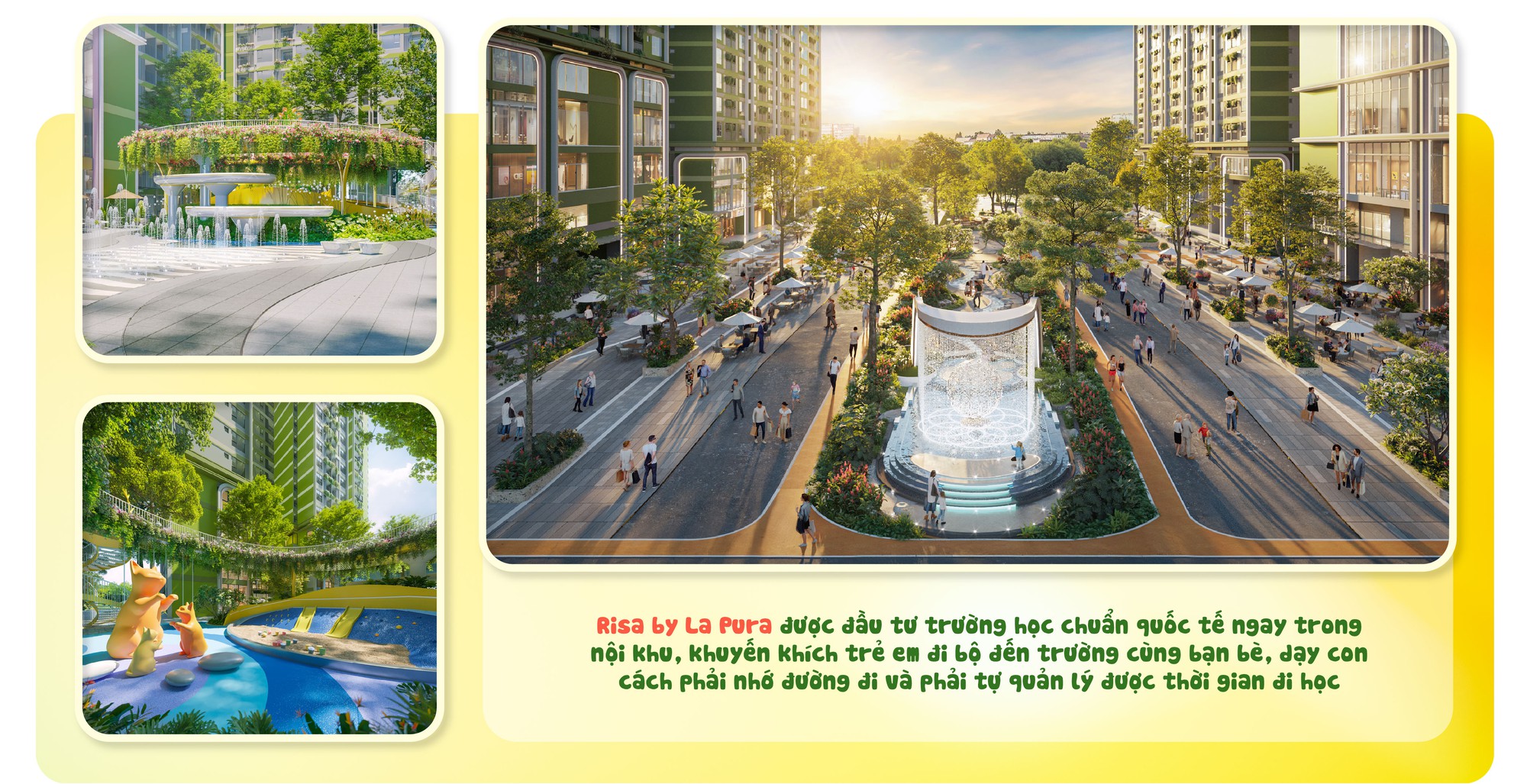 Đặc biệt, Risa by La Pura được đầu tư trường học chuẩn quốc tế ngay trong nội khu, khuyến khích trẻ em đi bộ đến trường cùng bạn bè, dạy con cách phải nhớ đường đi và phải tự quản lý được thời gian đi học sao cho đúng giờ, về nhà lúc nào để không bỏ lỡ loạt trải nghiệm khám phá đang đợi mình ở nội khu dưới chân nhà.