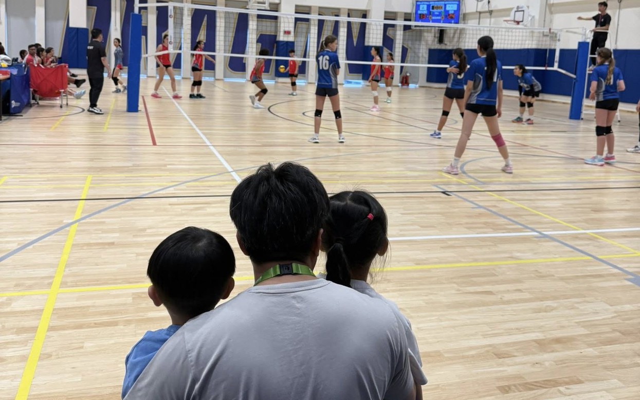 Cường Đô La đưa con gái Suchin và con trai út Suchin đi xem anh cả Subeo thi đấu bóng chuyền.