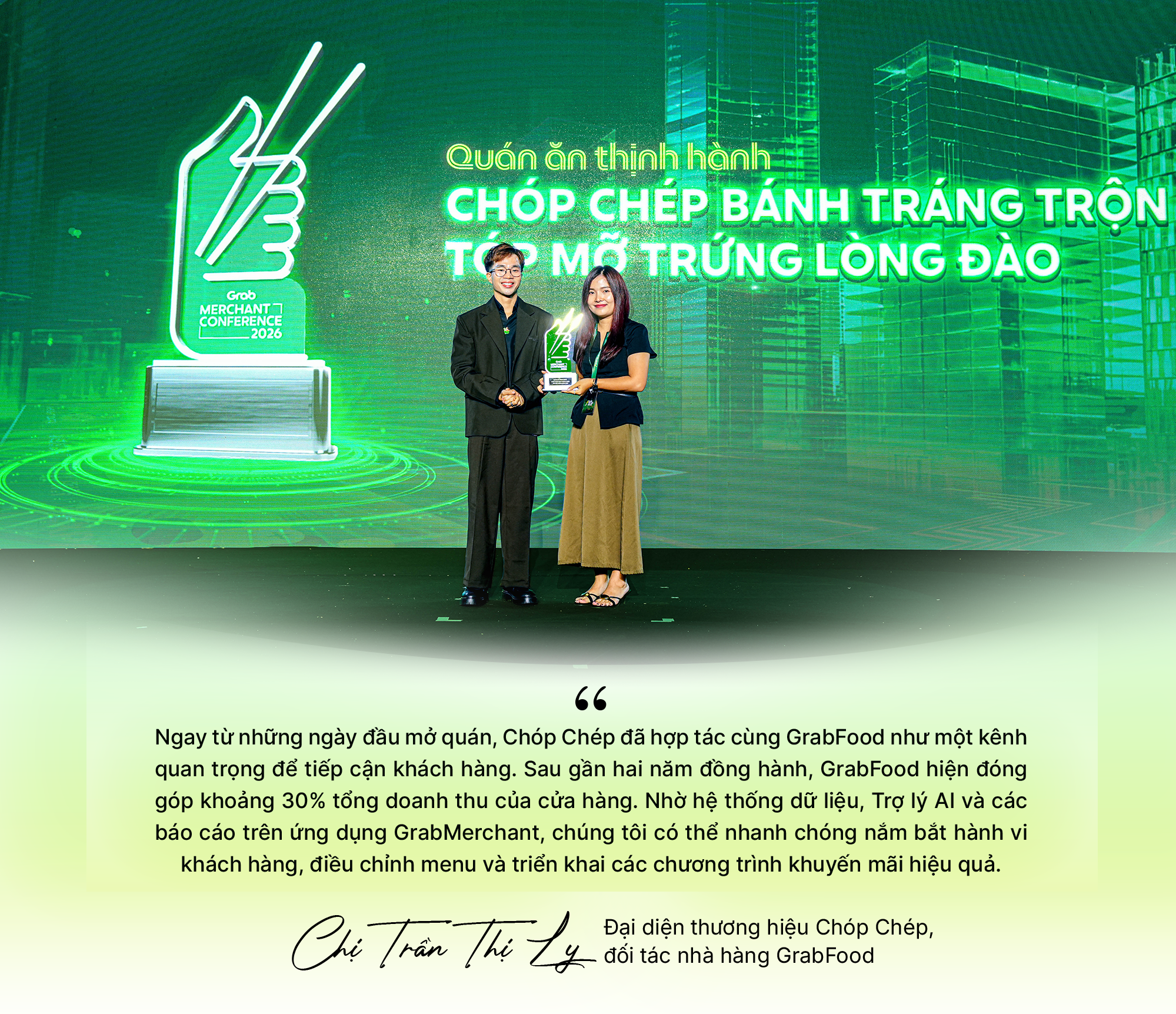Chị Trần Thị Ly, đại diện thương hiệu Chóp Chép, đối tác nhà hàng GrabFood chia sẻ: " Ngay từ những ngày đầu mở quán, Chóp Chép đã hợp tác cùng GrabFood như một kênh quan trọng để tiếp cận khách hàng. Sau gần hai năm đồng hành, GrabFood hiện đóng góp khoảng 30% tổng doanh thu của cửa hàng. Nhờ hệ thống dữ liệu, Trợ lý AI và các báo cáo trên ứng dụng GrabMerchant, chúng tôi có thể nhanh chóng nắm bắt hành vi khách hàng, điều chỉnh menu và triển khai các chương trình khuyến mãi hiệu quả."