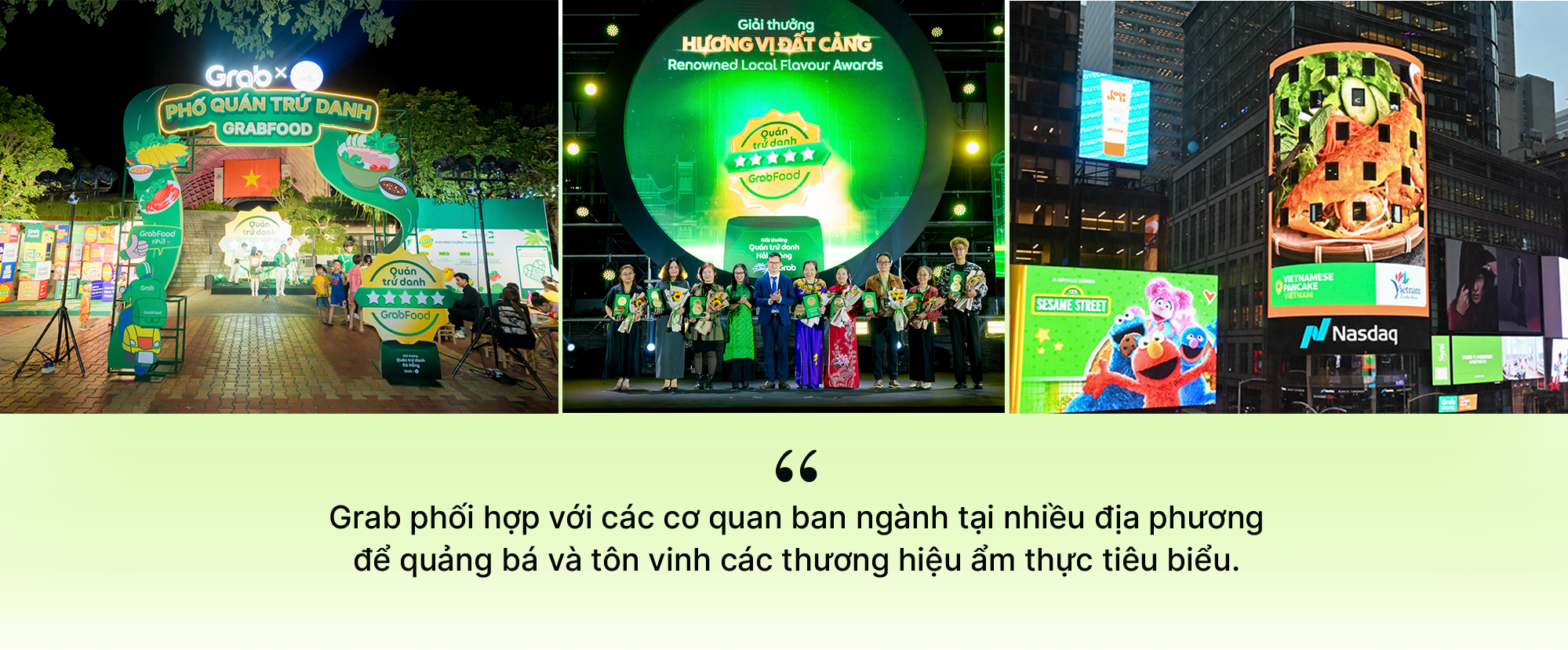 Trong những năm qua, thông qua hợp tác với các cơ quan ban ngành, Grab cũng đẩy mạnh quảng bá và nâng tầm các thương hiệu ẩm thực đặc trưng tại địa phương tới các du khách, tiêu biểu như lễ trao giải Quán "Trứ Danh" nhằm góp phần lan tỏa giá trị ẩm thực của từng vùng miền đến với người dùng. Ở quy mô quốc tế, chiến dịch quảng bá của Grab tại Quảng trường Thời Đại (New York) cũng tôn vinh các đối tác thương nhân trên nền tảng, góp phần giới thiệu ẩm thực Việt Nam đến với du khách quốc tế. Những hoạt động này góp phần giúp nhà hàng nâng cao mức độ nhận diện và mở rộng cơ hội tiếp cận khách hàng, bao gồm cả du khách trong và ngoài nước.