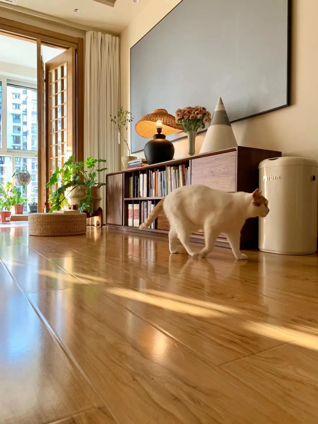 Sàn gỗ tông ấm, ánh vàng cam nhẹ giúp tổng thể không gian trở nên dễ chịu. Khi kết hợp cùng nội thất màu sáng và cây xanh, căn phòng tạo cảm giác thư giãn đúng nghĩa sau một ngày làm việc.