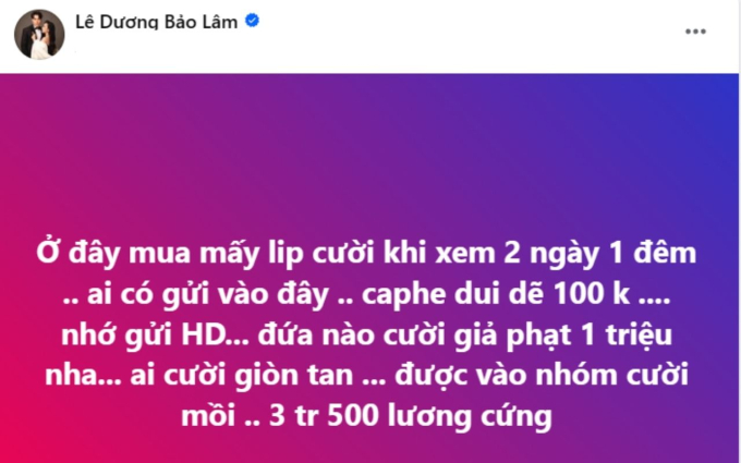 Vốn nổi tiếng với những màn tương tác hài hước trên mạng xã hội cùng người hâm mộ, không ít lần Lê Dương Bảo Lâm tạo ra những thử thách cùng các phần thưởng hậu hĩnh thu hút sự quan tâm của cộng đồng mạng. Mới đây, nam danh hài đã bất ngờ ra giá 100 nghìn cho mỗi clip cười được gửi về khi xem chương trình 2 ngày 1 đêm.