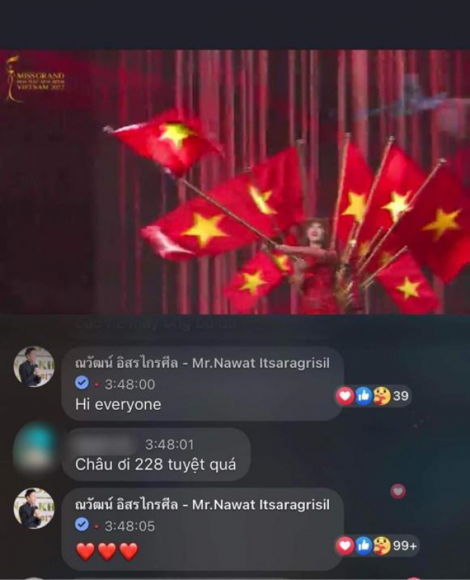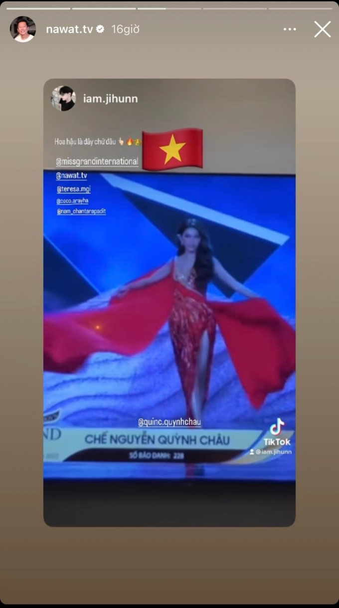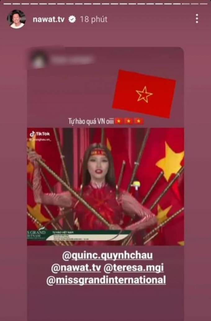 Trong đêm thi Trang phục Văn hóa Dân tộc ngày 23/9, khán giả cũng phát hiện Mr. Nawat đã vào xem livestream đúng ngay lúc Quỳnh Châu bước ra cùng bộ trang phục "Tự hào Việt Nam". Ngay sau đó, ông còn hào hứng chia sẻ lại màn biểu diễn trên trong story của mình.