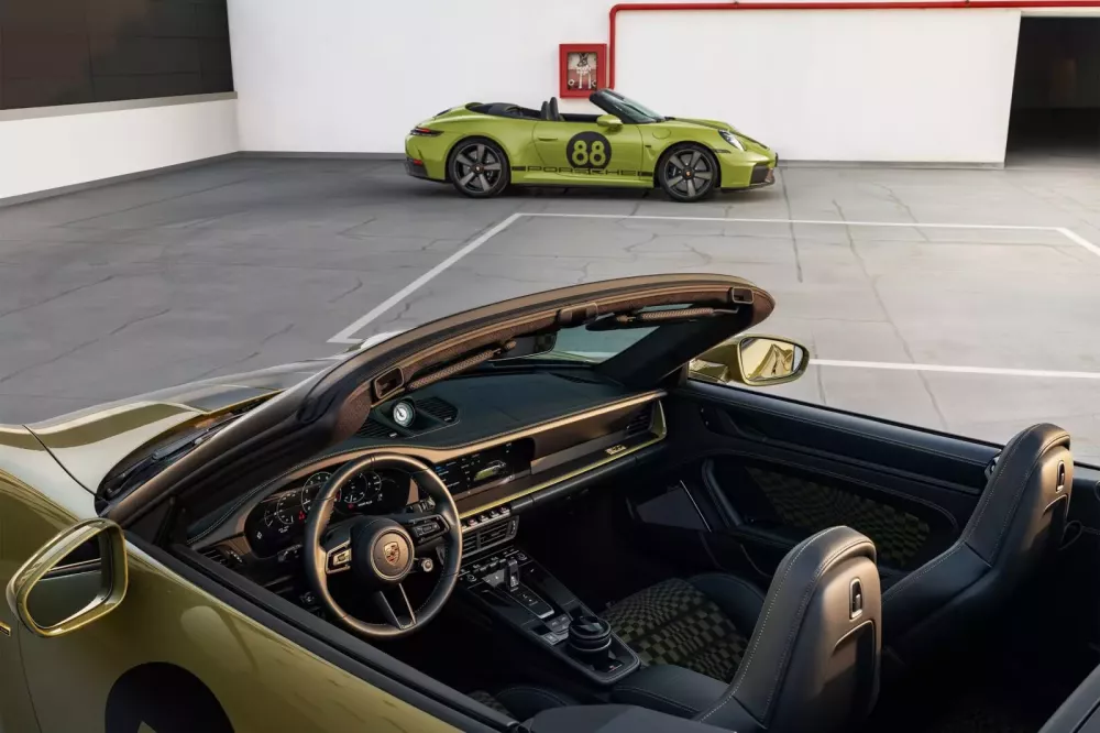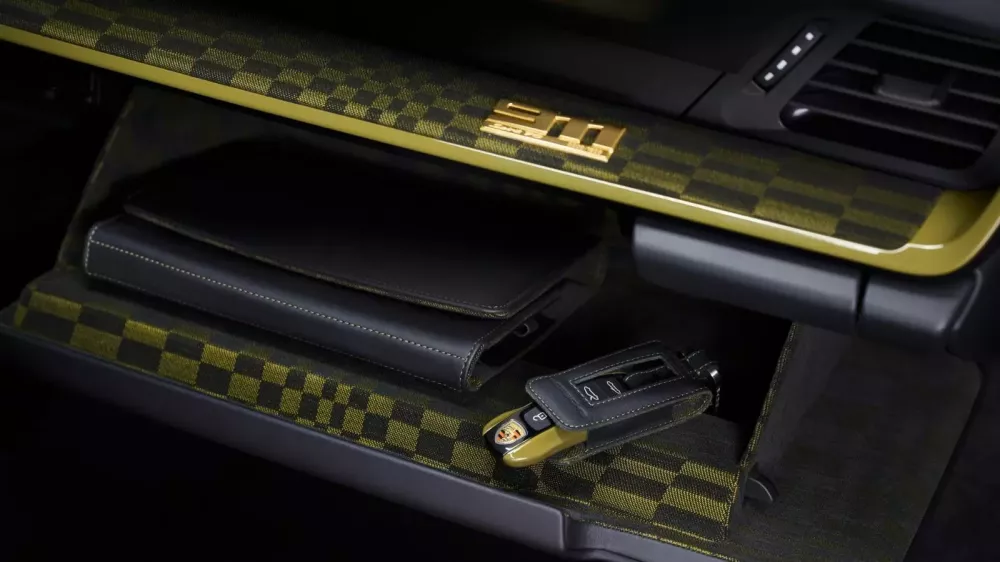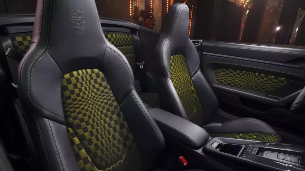 Nội thất của Spirit được thiết kế để phù hợp với vẻ ngoài của nó, và điều đó có nghĩa là ở đây chúng ta cũng có màu Olive Neo kết hợp với màu đen. Hai màu này được sử dụng trên họa tiết vải Pasha trên ghế thể thao chỉnh 18 hướng, trông giống như một lá cờ ca rô chuyển động, cũng như trên gương chiếu hậu và hộc đựng đồ. Để biến trải nghiệm Spirit trở nên đáng nhớ hơn nữa, Porsche đã tiến xa đến mức sửa đổi cụm đồng hồ của chiếc 911 tiêu chuẩn để phù hợp với thông điệp của phiên bản đặc biệt này.