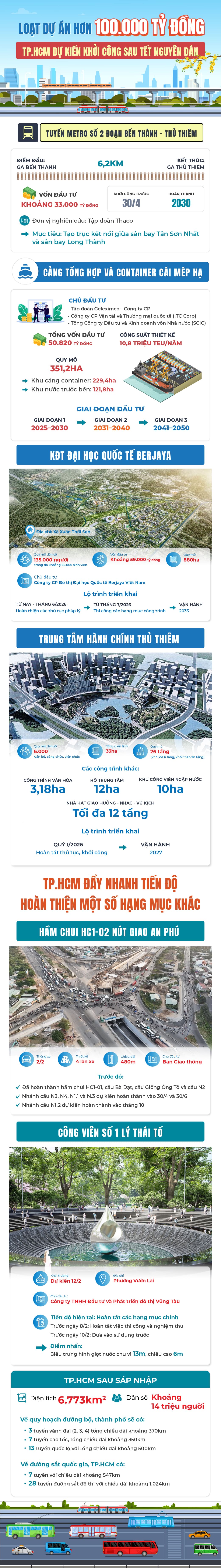 Ngay sau Tết Nguyên đán 2026, TP.HCM dự kiến đồng loạt khởi công các dự án quy mô lớn với tổng vốn đầu tư vượt 100.000 tỷ đồng. Danh mục dự án dự kiến "ra quân" đợt này trải rộng nhiều lĩnh vực, nổi bật là tuyến metro số 2 đoạn Bến Thành - Thủ Thiêm, cảng Cái Mép Hạ, trung tâm hành chính mới tại Thủ Thiêm và khu đô thị Đại học Quốc tế Berjaya.