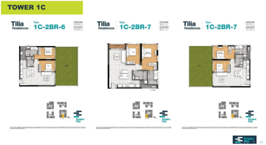 Mặt bằng tổng thể Empire City khu căn hộ được chia thành 4 phân khu khác nhau. Layout mỗi phân khu sẽ có sự thay đổi theo từng tầng. Tiêu chuẩn mỗi phân khu nhà đều có tầng hầm với chức năng làm bãi giữ xe, tầng khối đế sử dụng làm khu thương mại và khu chức năng sinh hoạt cộng đồng, các tầng còn lại là tầng căn hộ với các căn diện tích đa dạng từ 60-300m2.