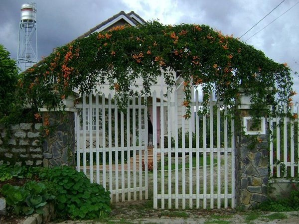 Mẫu cổng nhà vườn bằng gỗ được trồng hoa.