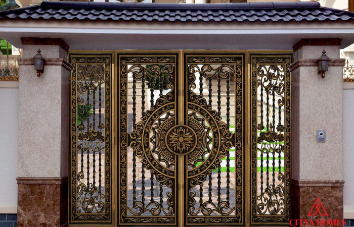 Cổng nhà vườn đẹp bằng nhôm đúc: được áp dụng công nghệ hiện đại nên có độ bền màu, không gỉ, có thể tạo được hình dạng màu sắc theo ý muốn, sử dụng được lâu dài.