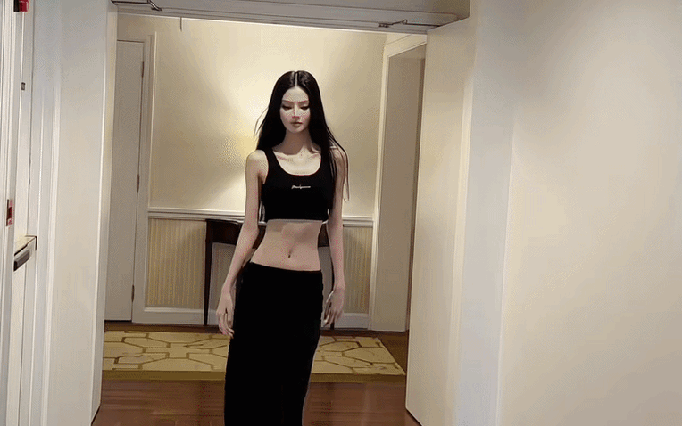 Trong khoảnh khắc sải bước trên phố, Hương Giang gây ấn tượng với vóc dáng mảnh mai cùng tỷ lệ cơ thể siêu thực. Thân hình thanh thoát, tay chân thon dài cùng khung xương nhỏ khiến tổng thể càng thêm nổi bật giữa khung cảnh đời thường. Đặc biệt, vòng eo mỏng dính, phẳng lì và gần như “lọt thỏm” giữa phần hông và lồng ngực càng làm nổi bật body ấn tượng. Nữ người mẫu lựa chọn set đồ đen tối giản gồm áo crop top và chân váy dài ôm mềm mại, thiết kế cạp trễ khéo léo khoe trọn vòng hai siêu nhỏ cùng đường thắt eo sắc nét.