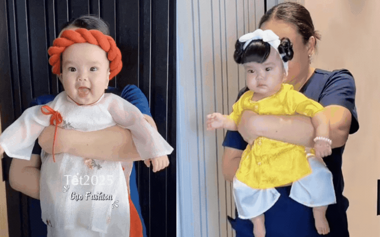 Điểm đặc biệt là các thiết kế đều mang đậm không khí Tết Việt. Những chiếc áo dài nhỏ xinh với màu sắc tươi tắn, họa tiết rực rỡ giúp bé Gạo trông vừa đáng yêu vừa nổi bật. Khi thì là áo dài thướt tha đúng chuẩn "tiểu thư nhí", lúc lại là áo bà ba giản dị nhưng không kém phần duyên dáng, mang lại cảm giác gần gũi, truyền thống.