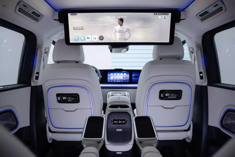 Những người ngồi ở hàng ghế sau sẽ được trang bị hệ thống MBUX, bao gồm màn hình toàn cảnh 31,3 inch với độ phân giải 8K, công nghệ chia màn hình và camera 8 megapixel. Màn hình này được gắn trên trần xe phía trên ghế trước và tự động thu gọn khi không sử dụng.