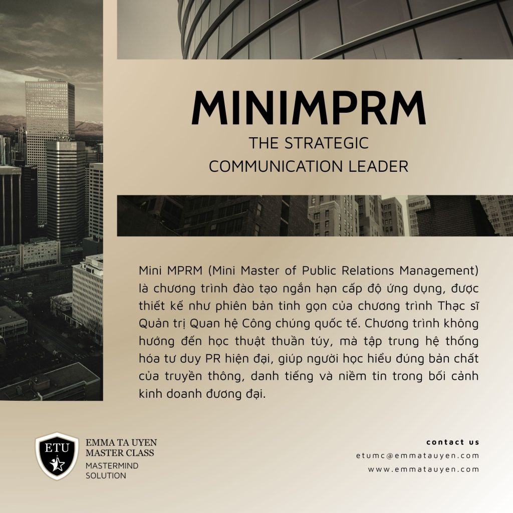 Mini MPRM (Mini Master of Public Relations Management) là chương trình đào tạo ngắn hạn cấp độ ứng dụng, được thiết kế như phiên bản tinh gọn của chương trình Thạc sĩ Quản trị Quan hệ Công chúng quốc tế. Chương trình không hướng đến học thuật thuần túy, mà tập trung hệ thống hóa tư duy PR hiện đại, giúp người học hiểu đúng bản chất của truyền thông, danh tiếng và niềm tin trong bối cảnh kinh doanh đương đại. Mini MPRM đồng thời đóng vai trò là bước đệm tư duy cho những học viên có định hướng tiếp tục theo học các chương trình Thạc sĩ chính thức trong tương lai.