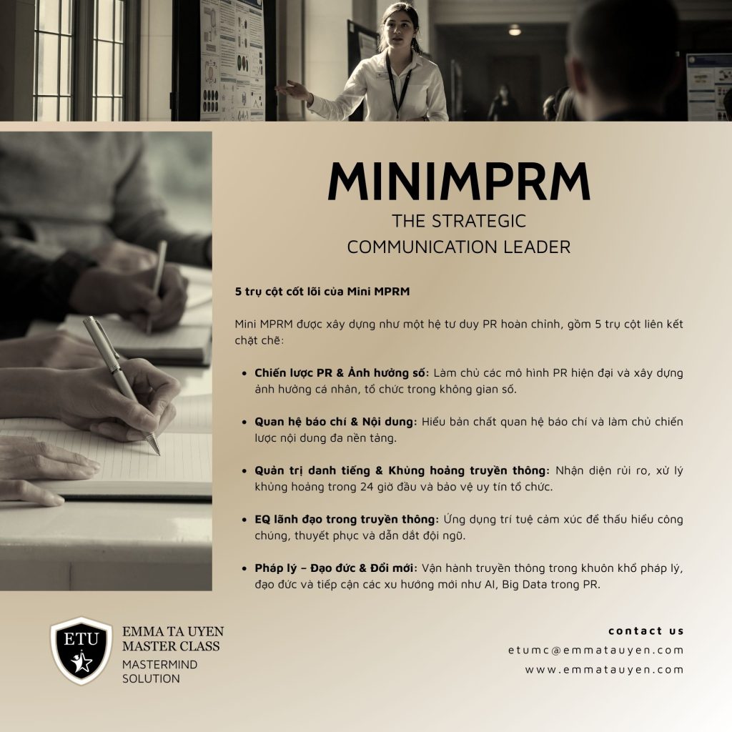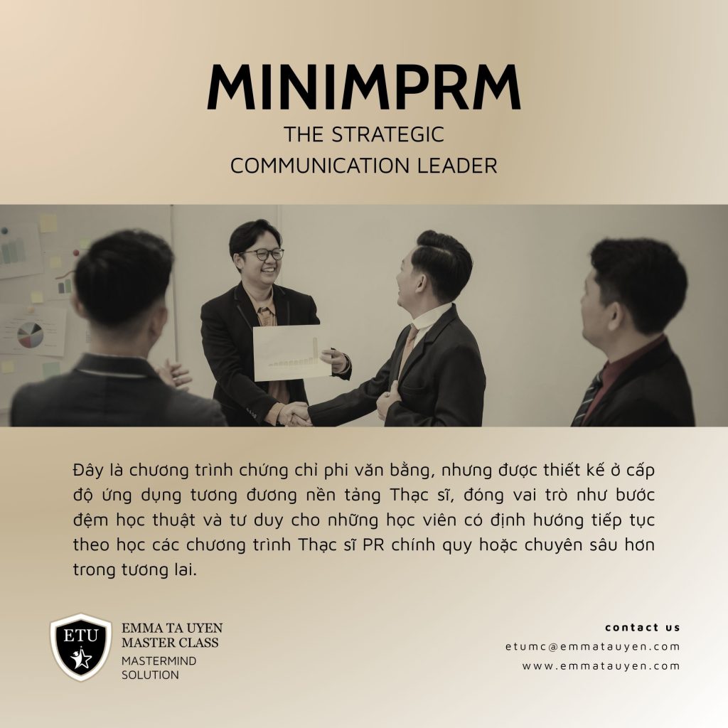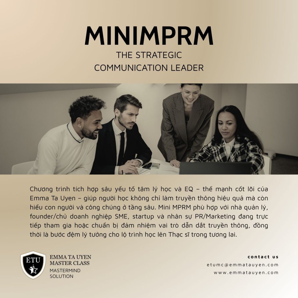 Mini MPRM được thiết kế theo triết lý tối giản nhưng có chiều sâu, loại bỏ những lý thuyết học thuật không cần thiết để tập trung vào tư duy và công cụ mà nhà lãnh đạo thương hiệu thực sự cần. Chương trình tích hợp sâu yếu tố tâm lý học và EQ – thế mạnh cốt lõi của Emma Ta Uyen – giúp người học không chỉ làm truyền thông hiệu quả mà còn hiểu con người và công chúng ở tầng sâu. Mini MPRM phù hợp với nhà quản lý, founder/chủ doanh nghiệp SME, startup và nhân sự PR/Marketing đang trực tiếp tham gia hoặc chuẩn bị đảm nhiệm vai trò dẫn dắt truyền thông, đồng thời là bước đệm lý tưởng cho lộ trình học lên Thạc sĩ trong tương lai.