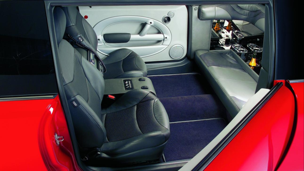 Bên cạnh chỗ ngồi có cách bố trí lạ và quầy bar cung cấp đồ uống, nội thất của Mini XXL còn trang bị nhiều món “đồ chơi đẳng cấp 2004” khác ví như tv màn hình phẳng có thể thu vào, một đầu DVD, một đầu CD với âm thanh tích hợp trong, điều hòa, da bọc màu đen và điện thoại để liên lạc tài xế ngồi phía trước.