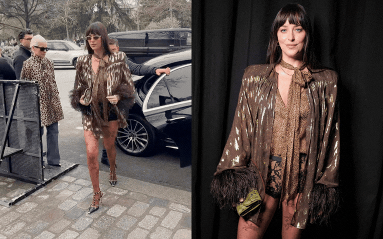 Outfit của Dakota Johnson tại sự kiện lần này là một tổ hợp khiến nhiều người phải dừng lại nhìn lâu hơn bình thường. Ấn tượng ban đầu, bộ cánh mang cảm giác “lộn xộn” khi tập hợp hàng loạt trend tưởng như không bao giờ nên đứng chung: chất liệu ánh kim lấp lánh, họa tiết kiểu da báo, lông vũ, quần ren đen, tất lưới đỏ thêu hoa, đinh tán. Chưa kể, cách mặc "không quần" với sơmi được sơvin bên trong lớp quần ren đen và quần tất mỏng tang cũng khiến nhiều người giật mình mỗi khi nhìn Dakota Johnson di chuyển, dù combo này đã được che bớt đi phần nào bằng áo khoác mềm mại bên ngoài.