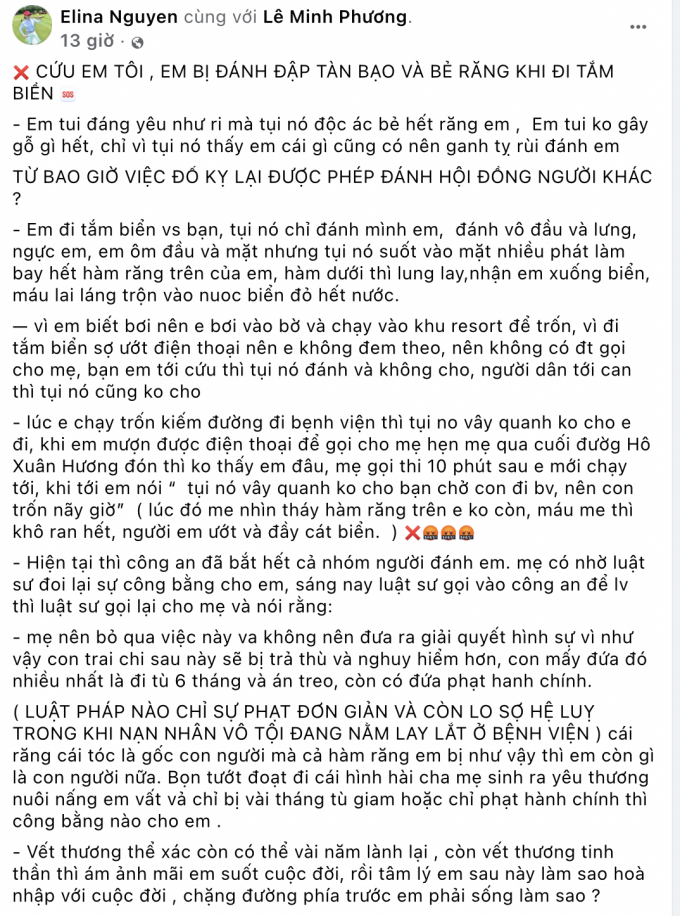 Chiều 21/5, mạng xã hội xuất hiện bài viết của chủ tài khoản tên E.N người nhà của nạn nhân T. (14 tuổi) bị nhóm thanh thiếu niên lạ mặt hành hung khi đang tắm biển Đà Nẵng.