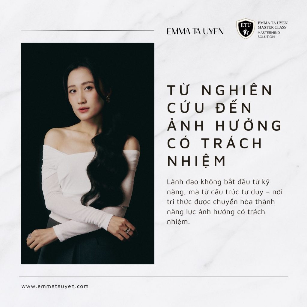 Trong hệ sinh thái Emma Ta Uyen Master Class, các khung tham chiếu từ khoa học hành vi, tâm lý học và quản trị hiện đại được tích hợp một cách có hệ thống. Mục tiêu không nằm ở thay đổi tức thời, mà ở việc hình thành năng lực tự nhận thức, khả năng ra quyết định và sự nhất quán trong hiện diện nghề nghiệp. Theo cách tiếp cận này, lãnh đạo không phải là vị trí, mà là một quá trình rèn luyện nội tại lâu dài.