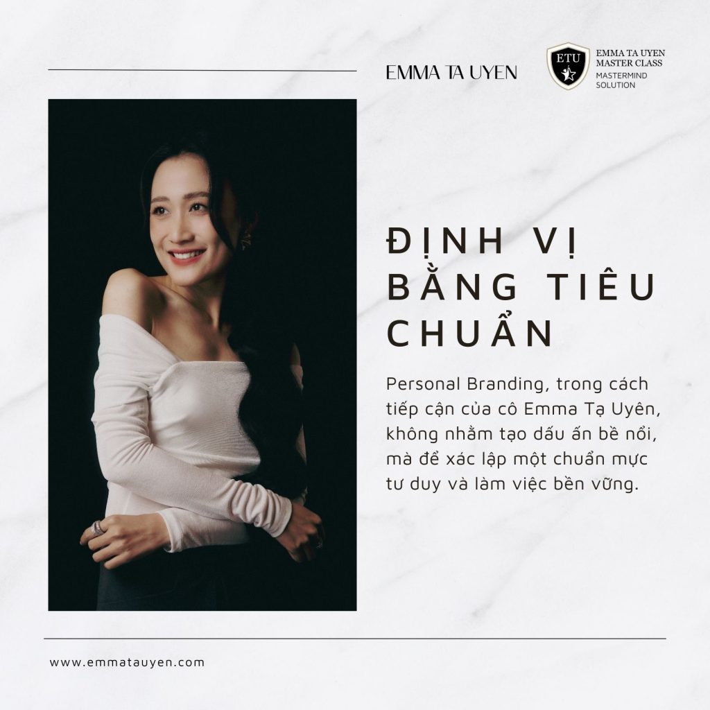 Một trọng tâm quan trọng trong định hướng của Emma Tạ Uyên là khái niệm Personal Branding được nhìn nhận dưới góc độ bản sắc. Với cô, định vị cá nhân không phải là chiến lược hình ảnh bề nổi, mà là sự rõ ràng về năng lực cốt lõi, hệ giá trị và trách nhiệm xã hội của người dẫn dắt.