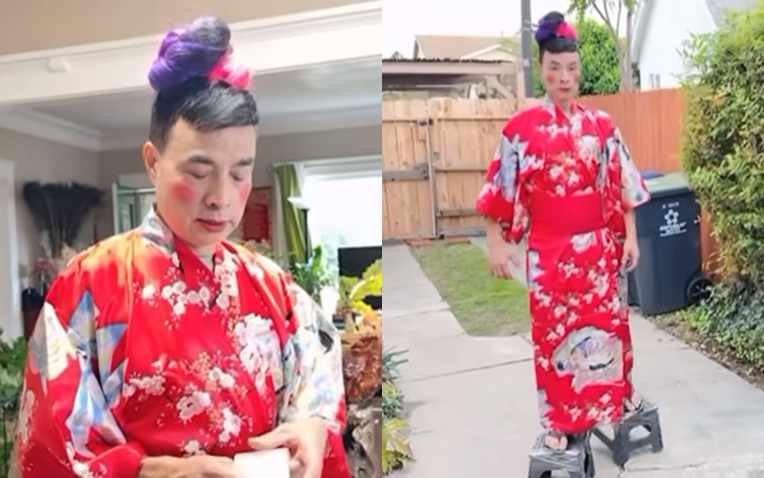 Trái với vẻ nghiêm túc, bình dị, ăn mặc giản đơn thường ngày, Tuấn Cảnh trong đoạn clip Thúy Nga chia sẻ lại make up đậm, cột tóc màu sắc, mặc kimono, giống như đang hóa trang vào một nhân vật hài hước nào đó, khiến ai cũng tò mò.