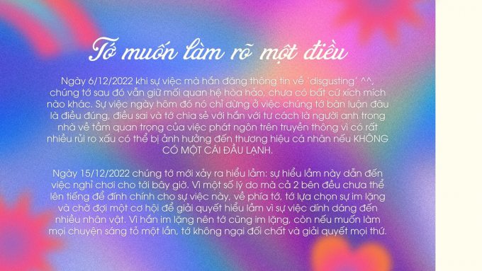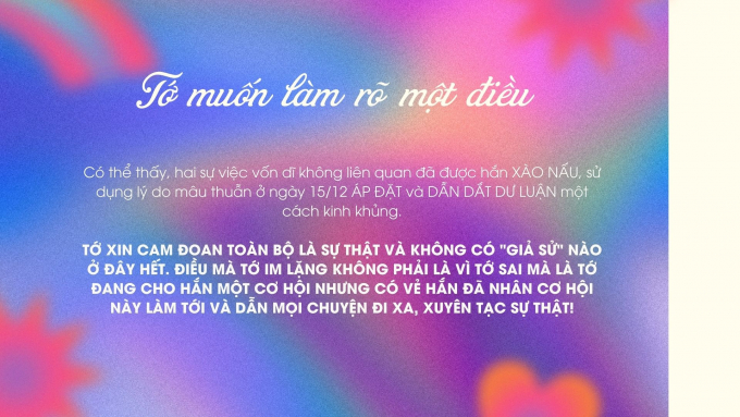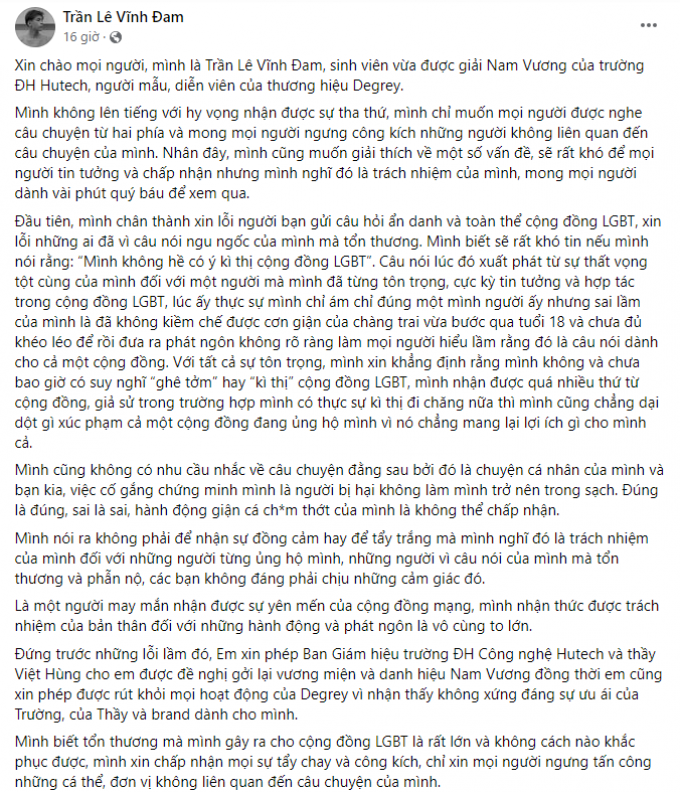 Để tránh sự việc đi quá xa, mới đây Vĩnh Đam đã đăng tải lên trang cá nhân một bài viết khá dài chia sẻ cụ thể câu chuyện. Đáng chú ý, một chi tiết mà anh đề cập: "Câu nói lúc đó xuất phát từ sự thất vọng tột cùng của mình đối với một người mà mình đã từng tôn trọng, cực kỳ tin tưởng và hợp tác trong cộng đồng LGBT" - khiến nhiều người suy đoán nhân vật ấy khả năng cao là TikToker Hoàng Nguyên, người cùng với Vĩnh Đam quay hình những video như một cặp đôi yêu nhau trên nền tảng TikTok.