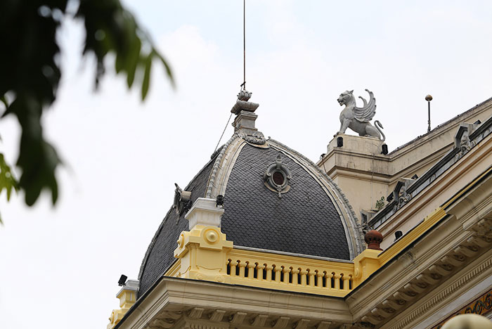 Ở phía trên của nhà hát lớn Hà Nội, hệ thống mái lợp ngói đá đen được thiết kế rất công phu với sự kết hợp của nhiều loại hình thức khác nhau. Tất cả những thiết kế tinh tế, độc đáo mang đến cho nhà hát lớn Hà Nội một không gian trang trọng, rực rỡ và đầy sức cuốn hút, ấn tượng với du khách tham quan.